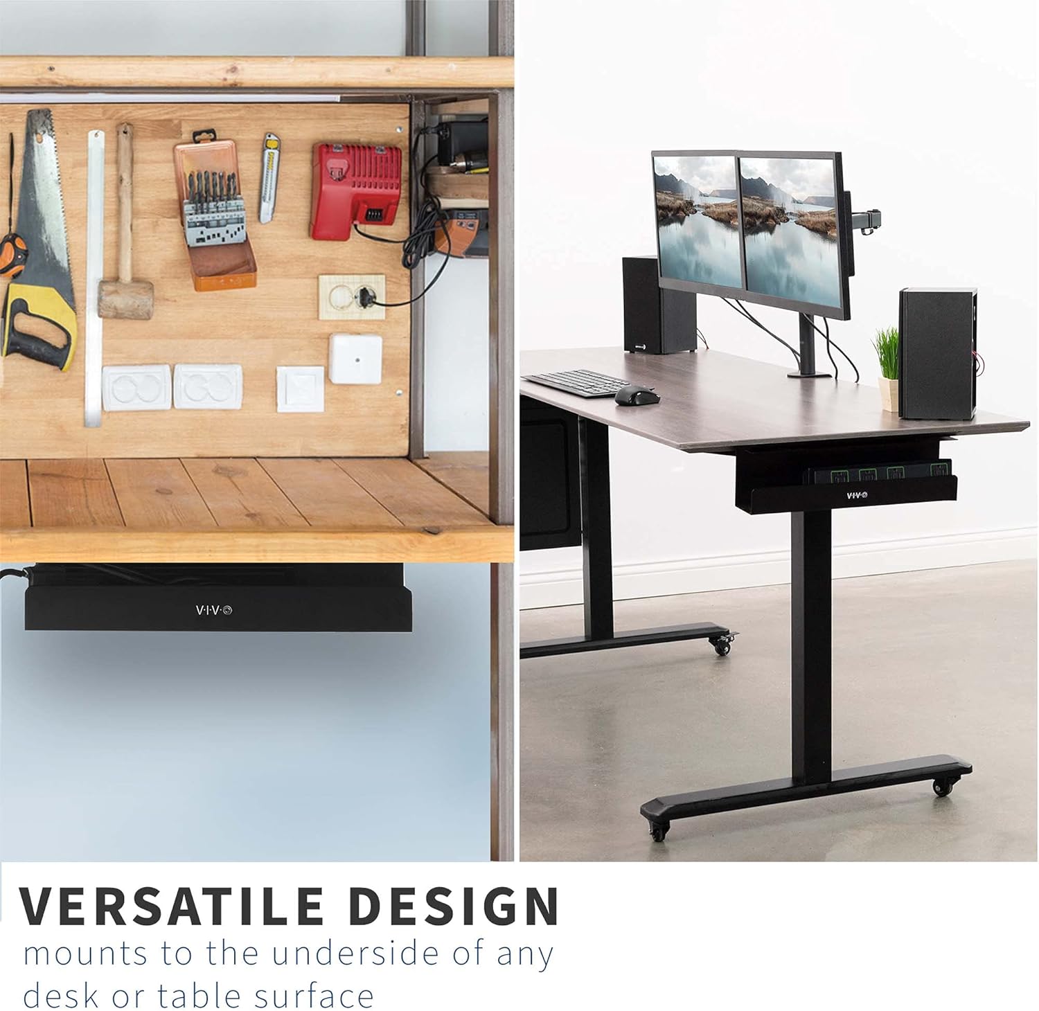 With multiple slots and openings, this wire tamer provides ample space to route and secure cables, while the built-in power strip holder keeps your surge protector in place and easily accessible. No more tripping over loose cords or struggling to find the right plug – the VIVO Cable Management Tray makes it easy to keep your workspace tidy and efficient.